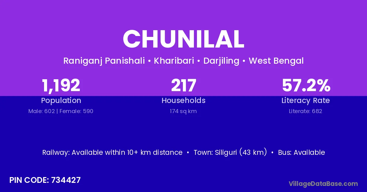 Siliguri (43 km) is the nearest town to Chunilal village for major economic activities and is located approximately 43 km away.