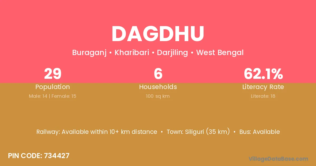 Siliguri (35 km) is the nearest town to Dagdhu village for major economic activities and is located approximately 35 km away.