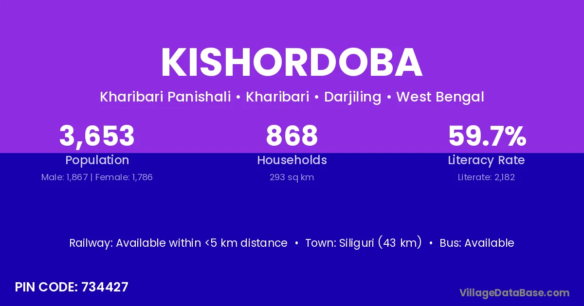 Siliguri (43 km) is the nearest town to Kishordoba village for major economic activities and is located approximately 43 km away.