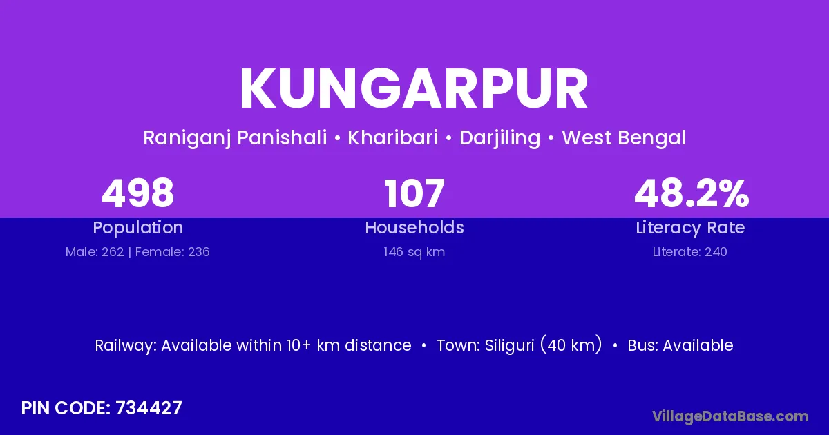 Siliguri (40 km) is the nearest town to Kungarpur village for major economic activities and is located approximately 40 km away.