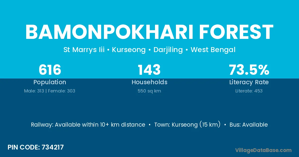 Kurseong (15 km) is the nearest town to Bamonpokhari Forest village for major economic activities and is located approximately 15 km away.