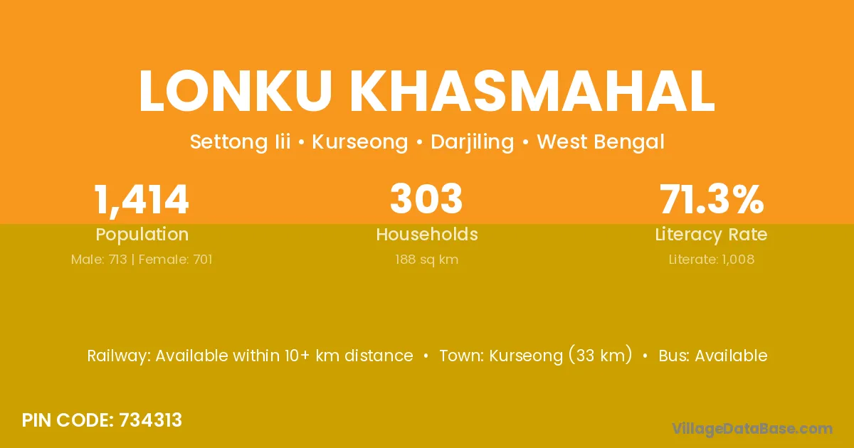 Kurseong (33 km) is the nearest town to Lonku Khasmahal village for major economic activities and is located approximately 33 km away.