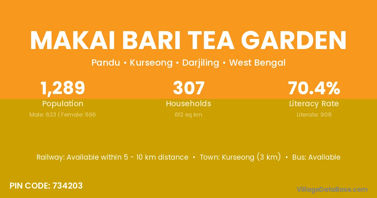 Kurseong (3 km) is the nearest town to Makai Bari Tea Garden village for major economic activities and is located approximately 3 km away.