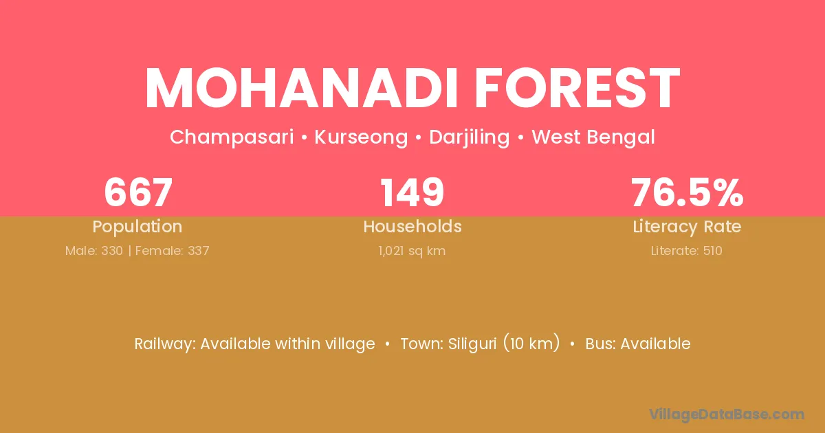 Siliguri (10 km) is the nearest town to Mohanadi Forest village for major economic activities and is located approximately 10 km away.