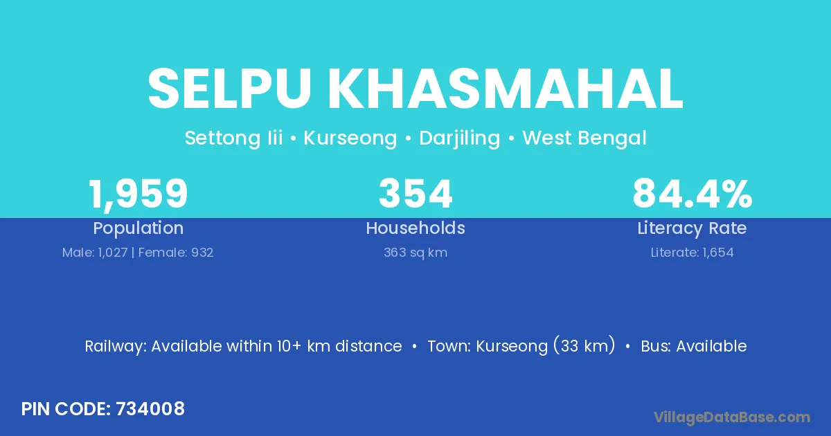 Kurseong (33 km) is the nearest town to Selpu Khasmahal village for major economic activities and is located approximately 33 km away.