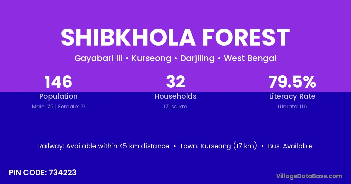 Kurseong (17 km) is the nearest town to Shibkhola Forest village for major economic activities and is located approximately 17 km away.