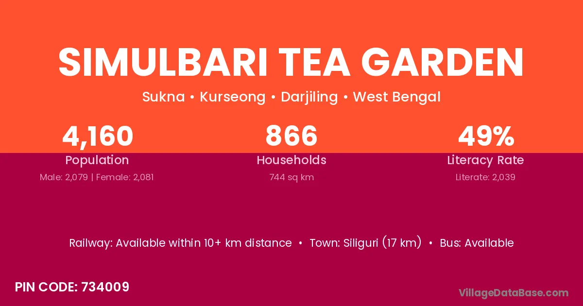 Siliguri (17 km) is the nearest town to Simulbari Tea Garden village for major economic activities and is located approximately 17 km away.