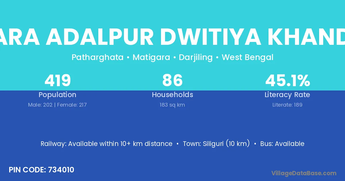 Siliguri (10 km) is the nearest town to Bara Adalpur Dwitiya Khanda village for major economic activities and is located approximately 10 km away.
