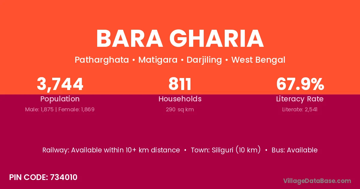 Siliguri (10 km) is the nearest town to Bara Gharia village for major economic activities and is located approximately 10 km away.