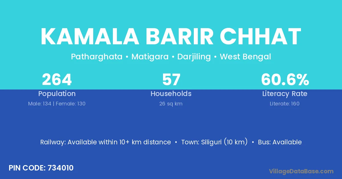 Siliguri (10 km) is the nearest town to Kamala Barir Chhat village for major economic activities and is located approximately 10 km away.
