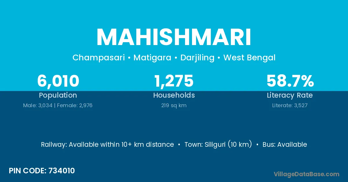 Siliguri (10 km) is the nearest town to Mahishmari village for major economic activities and is located approximately 10 km away.