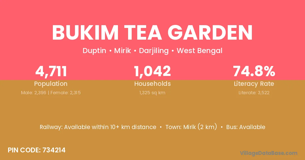 Mirik (2 km) is the nearest town to Bukim Tea Garden village for major economic activities and is located approximately 2 km away.