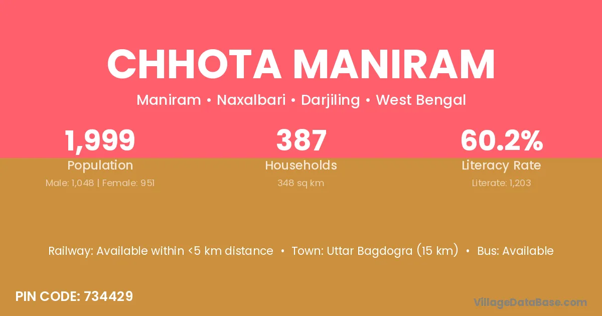 Uttar Bagdogra (15 km) is the nearest town to Chhota Maniram village for major economic activities and is located approximately 15 km away.