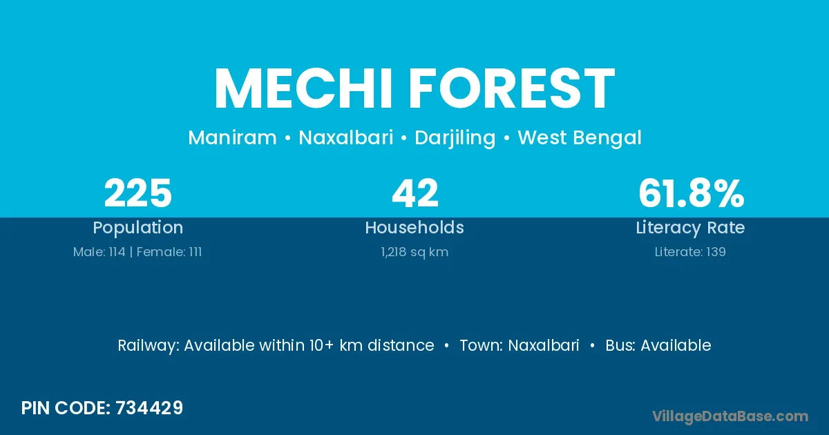 Mechi Forest village has a total population of 225 people, of which 114 are males and 111 are females.