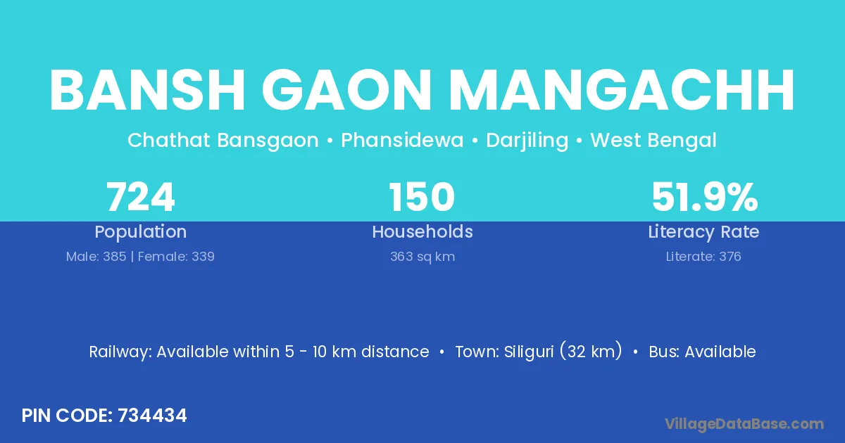 Siliguri (32 km) is the nearest town to Bansh Gaon Mangachh village for major economic activities and is located approximately 32 km away.