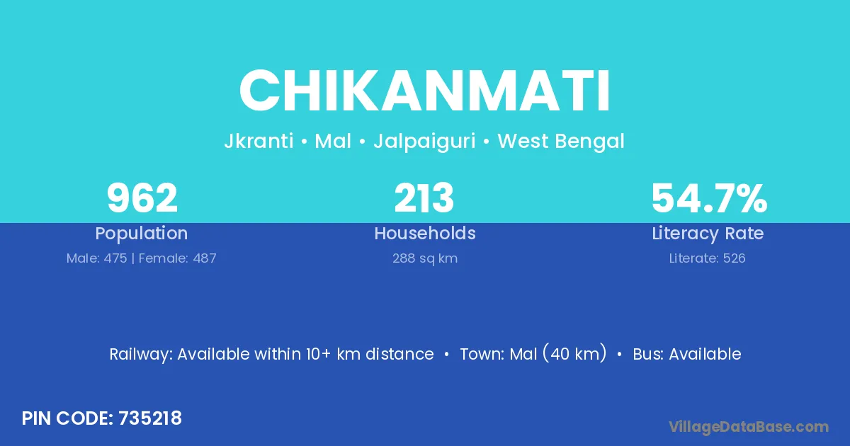 Siliguri (47 km) is the nearest town to Chikanmati village for major economic activities and is located approximately 47 km away.