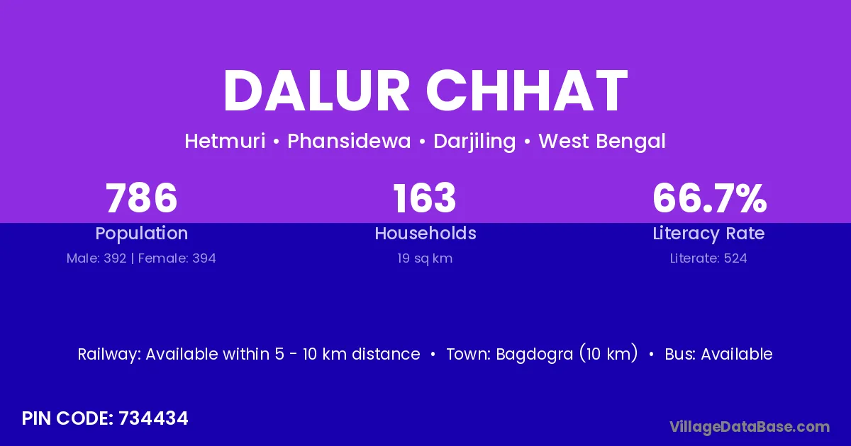 Bagdogra (10 km) is the nearest town to Dalur Chhat village for major economic activities and is located approximately 10 km away.
