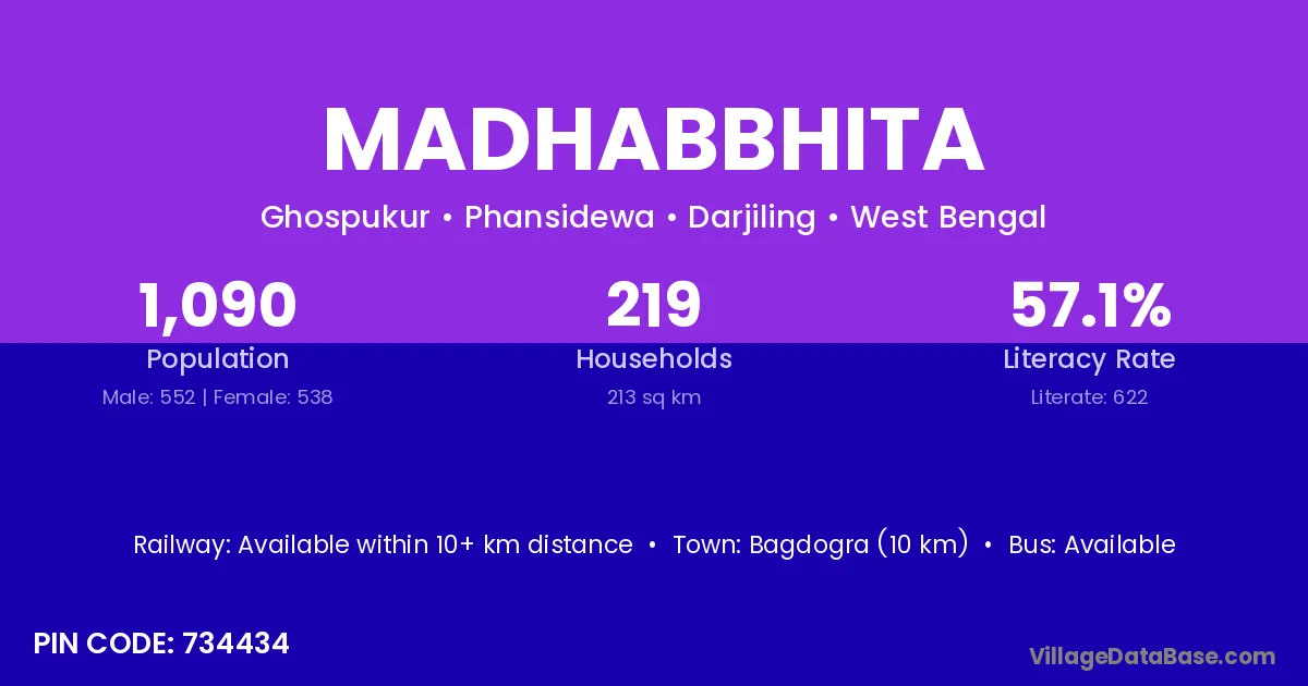 Bagdogra (10 km) is the nearest town to Madhabbhita village for major economic activities and is located approximately 10 km away.