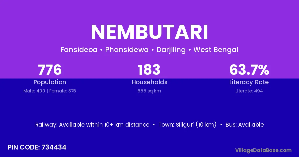 Siliguri (10 km) is the nearest town to Nembutari village for major economic activities and is located approximately 10 km away.