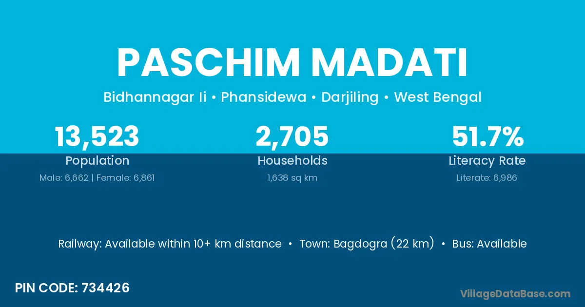 Bagdogra (22 km) is the nearest town to Paschim Madati village for major economic activities and is located approximately 22 km away.