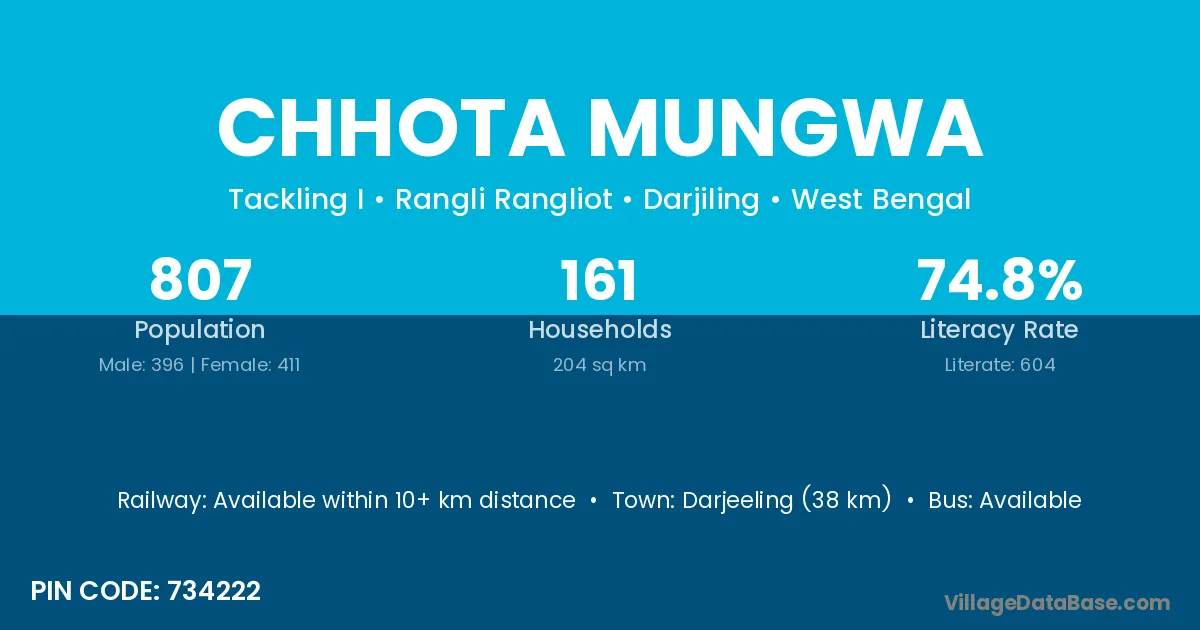 Darjeeling (38 km) is the nearest town to Chhota Mungwa village for major economic activities and is located approximately 38 km away.