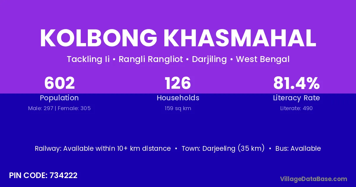 Darjeeling (35 km) is the nearest town to Kolbong Khasmahal village for major economic activities and is located approximately 35 km away.