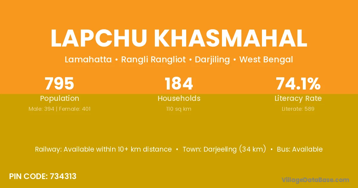 Darjeeling (34 km) is the nearest town to Lapchu Khasmahal village for major economic activities and is located approximately 34 km away.