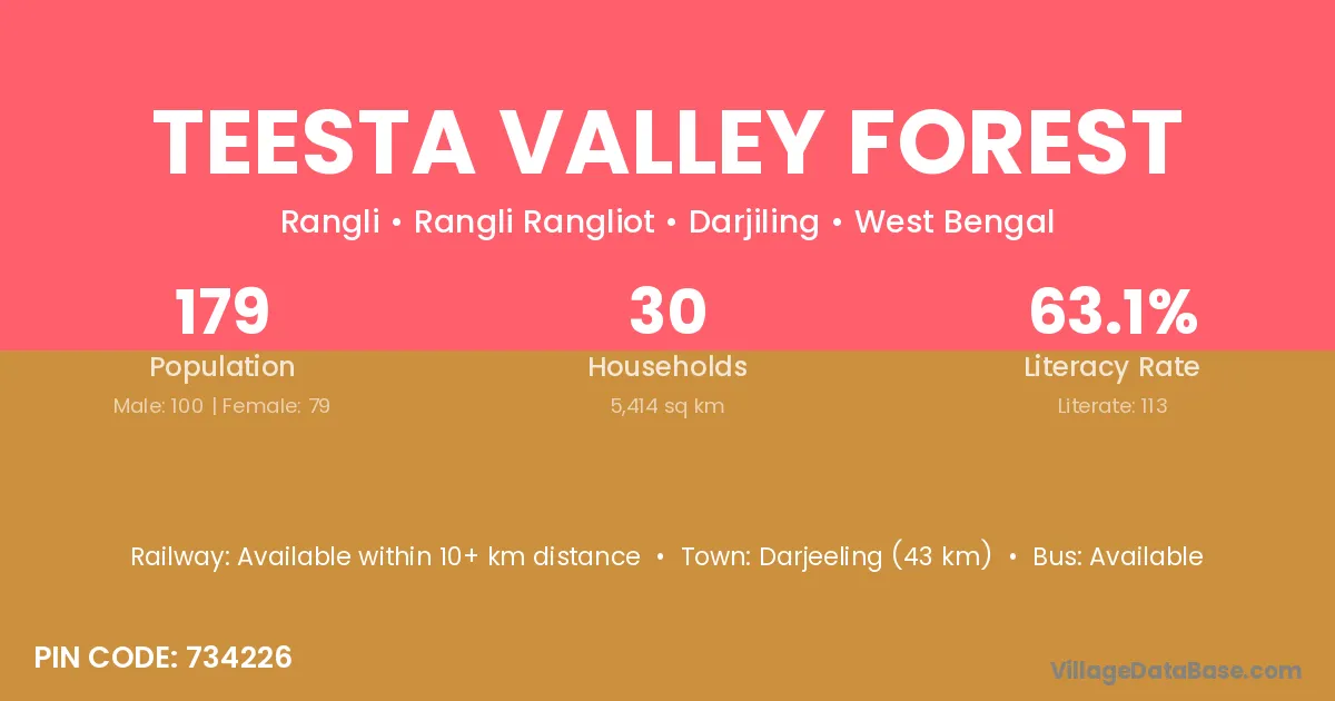 Teesta Valley Forest village has a total population of 179 people, of which 100 are males and 79 are females.