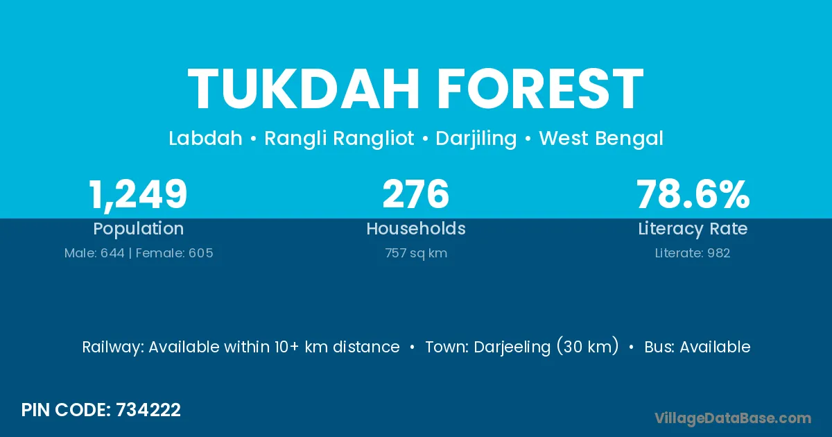 Darjeeling (30 km) is the nearest town to Tukdah Forest village for major economic activities and is located approximately 30 km away.