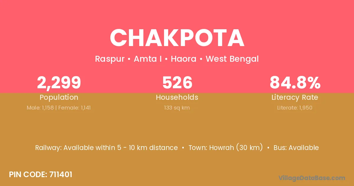 Howrah (30 km) is the nearest town to Chakpota village for major economic activities and is located approximately 30 km away.