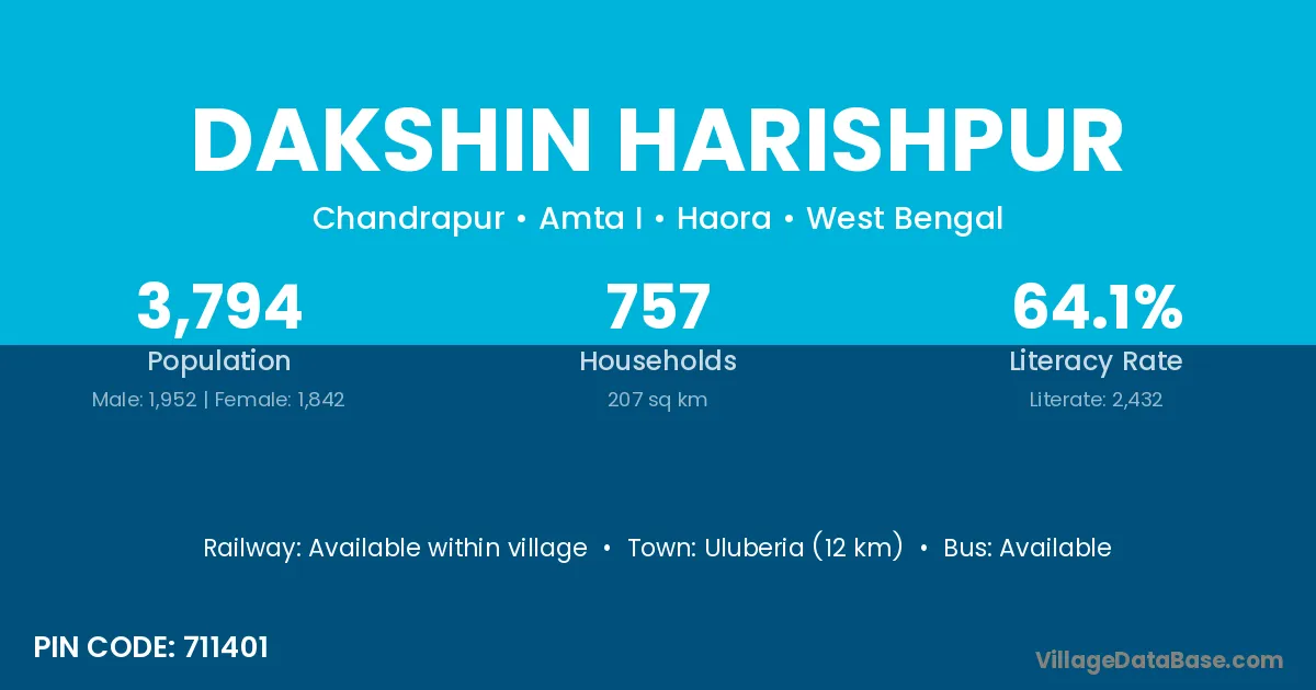 Uluberia (12 km) is the nearest town to Dakshin Harishpur village for major economic activities and is located approximately 12 km away.