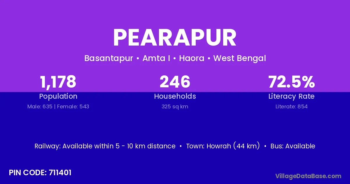 Howrah (44 km) is the nearest town to Pearapur village for major economic activities and is located approximately 44 km away.