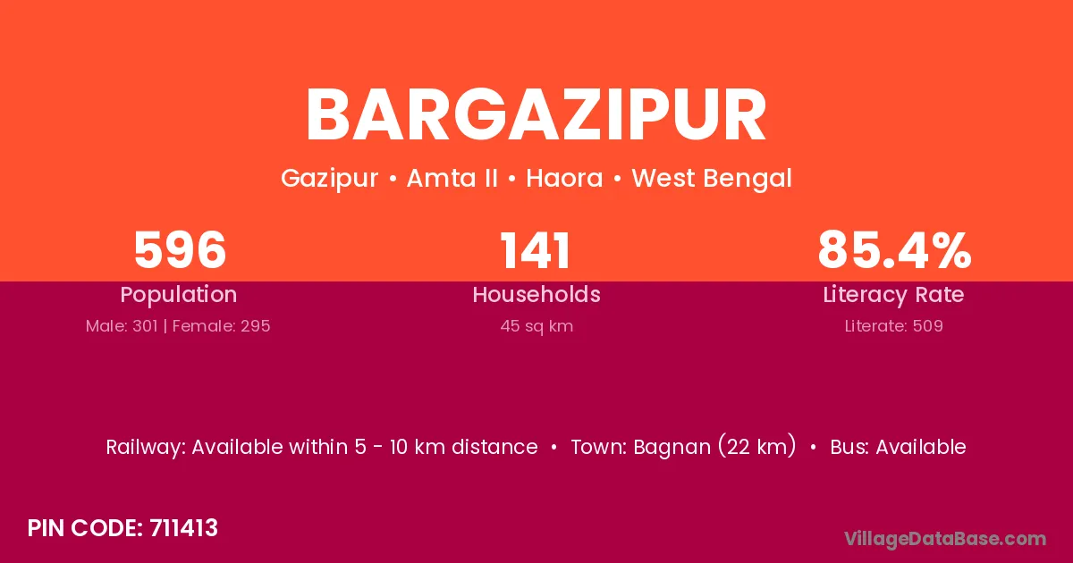 Bagnan (22 km) is the nearest town to Bargazipur village for major economic activities and is located approximately 22 km away.