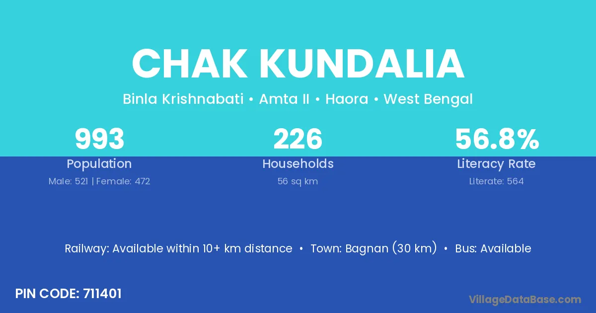 Bagnan (30 km) is the nearest town to Chak Kundalia village for major economic activities and is located approximately 30 km away.