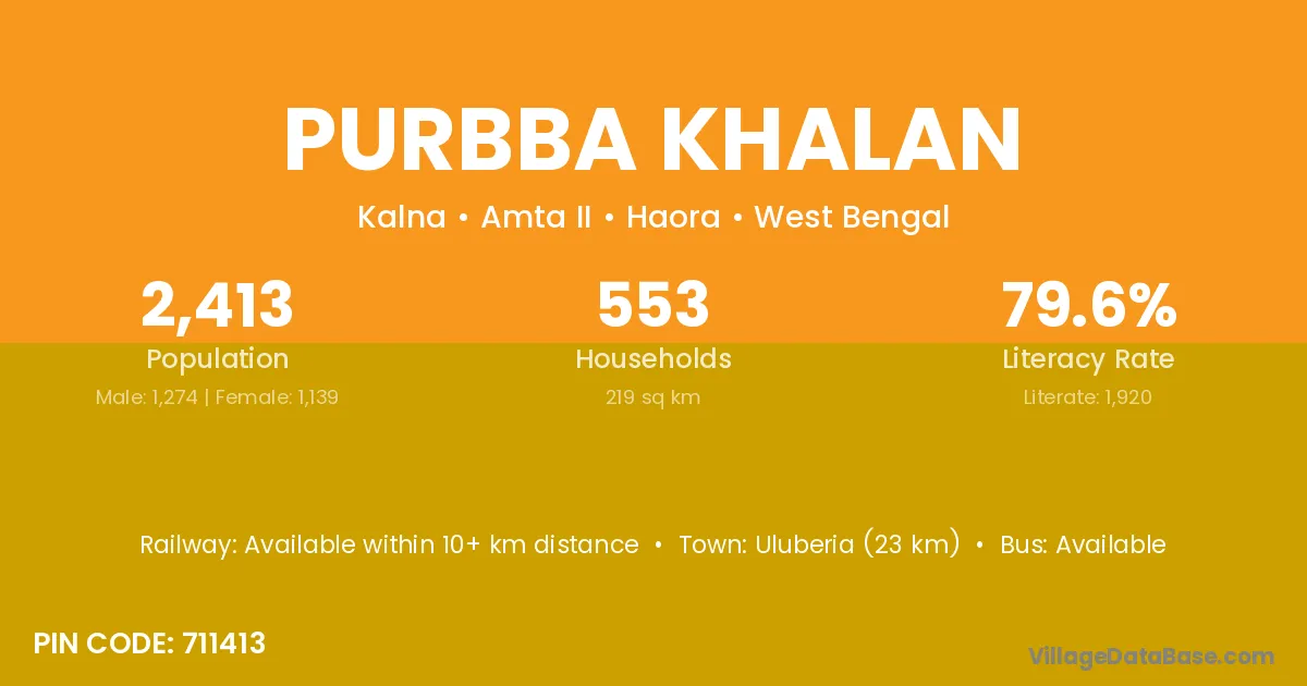 Uluberia (23 km) is the nearest town to Purbba Khalan village for major economic activities and is located approximately 23 km away.