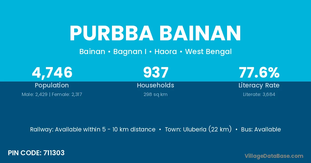 Uluberia (22 km) is the nearest town to Purbba Bainan village for major economic activities and is located approximately 22 km away.