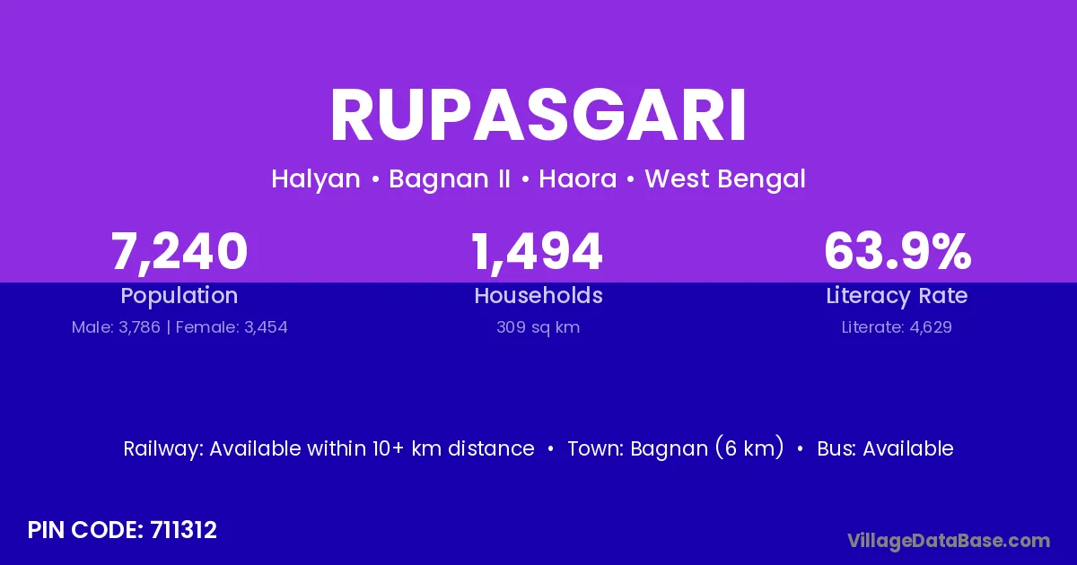 Bagnan (6 km) is the nearest town to Rupasgari village for major economic activities and is located approximately 6 km away.
