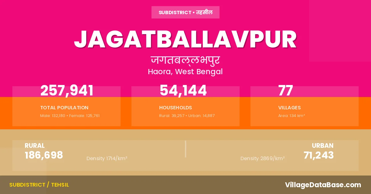 According to the 2011 census The total area of Jagatballavpur Subdivision is 134 km², with a population of 257941 people. The population density is 1,929 inhabitants per square kilometre, and there are approximately 54144 houses in the sub district.