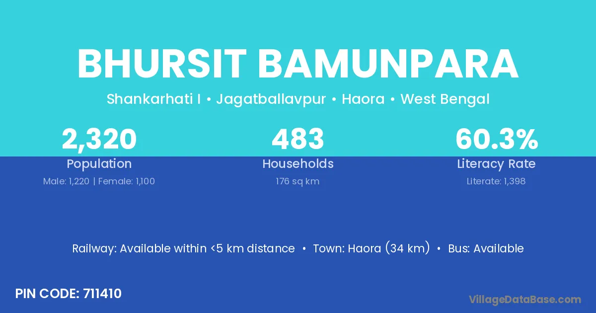 Haora (34 km) is the nearest town to Bhursit Bamunpara village for major economic activities and is located approximately 34 km away.
