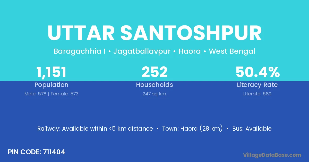 Haora (28 km) is the nearest town to Uttar Santoshpur village for major economic activities and is located approximately 28 km away.