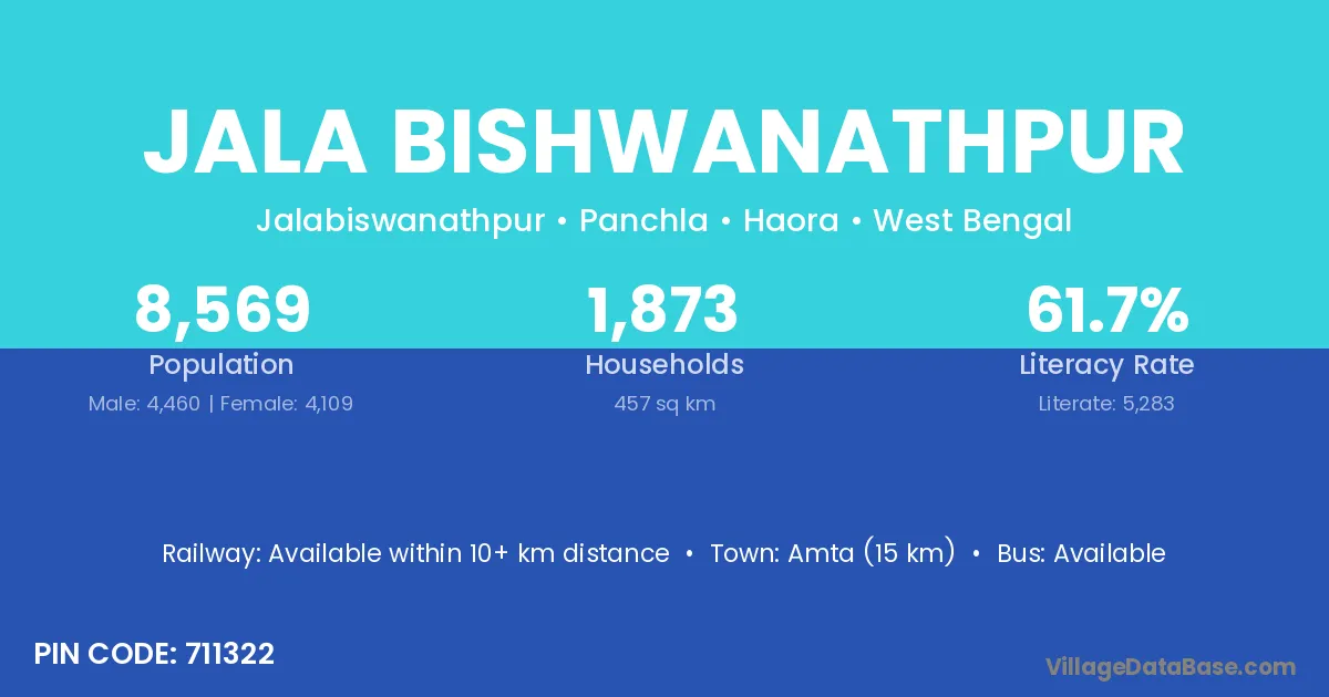 Amta (15 km) is the nearest town to Jala Bishwanathpur village for major economic activities and is located approximately 15 km away.