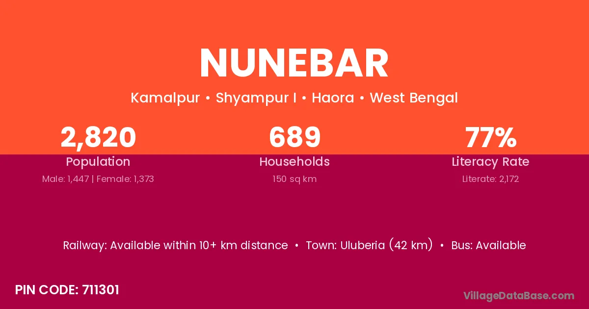 Uluberia (42 km) is the nearest town to Nunebar village for major economic activities and is located approximately 42 km away.