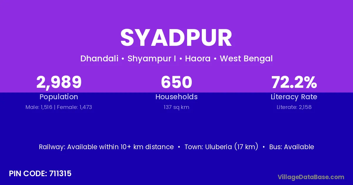 Uluberia (17 km) is the nearest town to Syadpur village for major economic activities and is located approximately 17 km away.