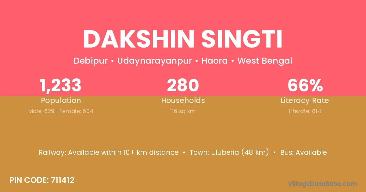 Uluberia (48 km) is the nearest town to Dakshin Singti village for major economic activities and is located approximately 48 km away.