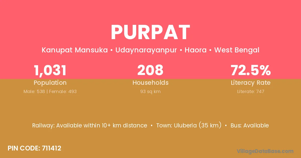 Uluberia (35 km) is the nearest town to Purpat village for major economic activities and is located approximately 35 km away.