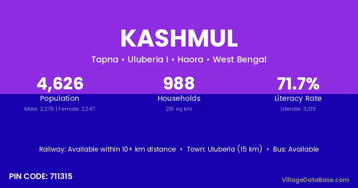Uluberia (15 km) is the nearest town to Kashmul village for major economic activities and is located approximately 15 km away.