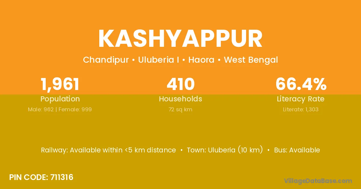 Uluberia (10 km) is the nearest town to Kashyappur village for major economic activities and is located approximately 10 km away.