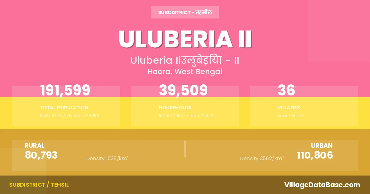 According to the 2011 census The total area of Uluberia II Subdivision is 109 km², with a population of 191599 people. The population density is 1,759 inhabitants per square kilometre, and there are approximately 39509 houses in the sub district.