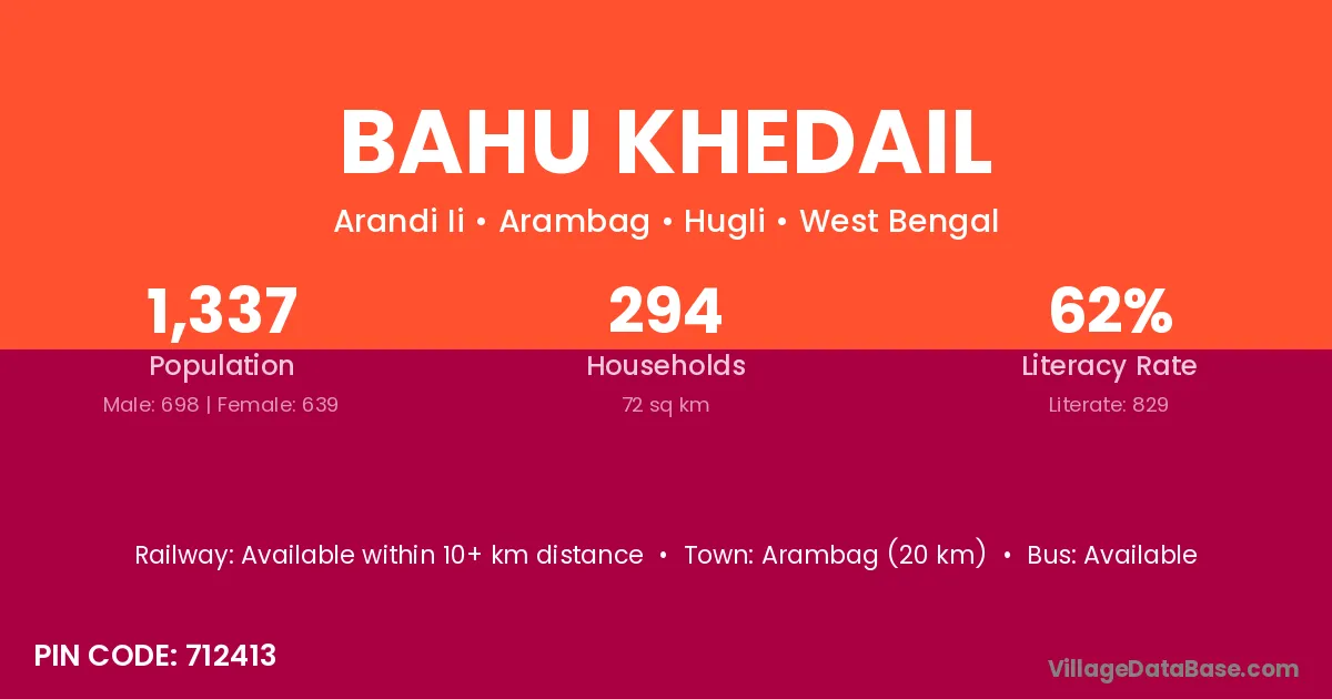 Arambag (20 km) is the nearest town to Bahu Khedail village for major economic activities and is located approximately 20 km away.