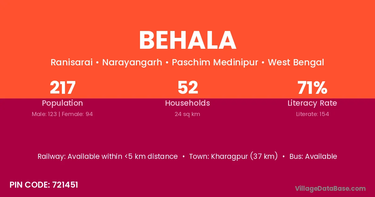 Arambagh (13 km) is the nearest town to Behala village for major economic activities and is located approximately 13 km away.